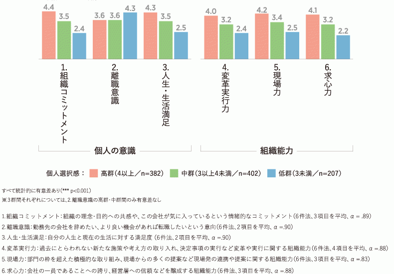 ・「4.変革実行力」「5.現場力」「6.求心力」は、当社の企業調査で個人選択型の配置ポリシーによる影響が確認された組織能力であるが、個人選択感においてもプラスの影響が見られた。