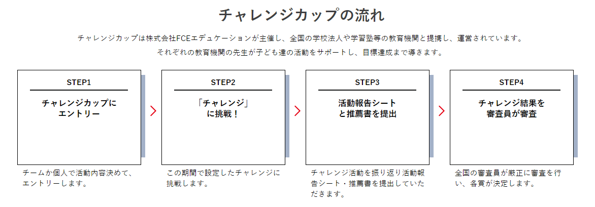 目標に対してどれだけ本気で挑戦し、どれだけ成長できたかを全国の教育機関の専門家達が審査し、特に優秀なチャレンジと評価されたチャレンジャー達には表彰状と副賞が贈られます。