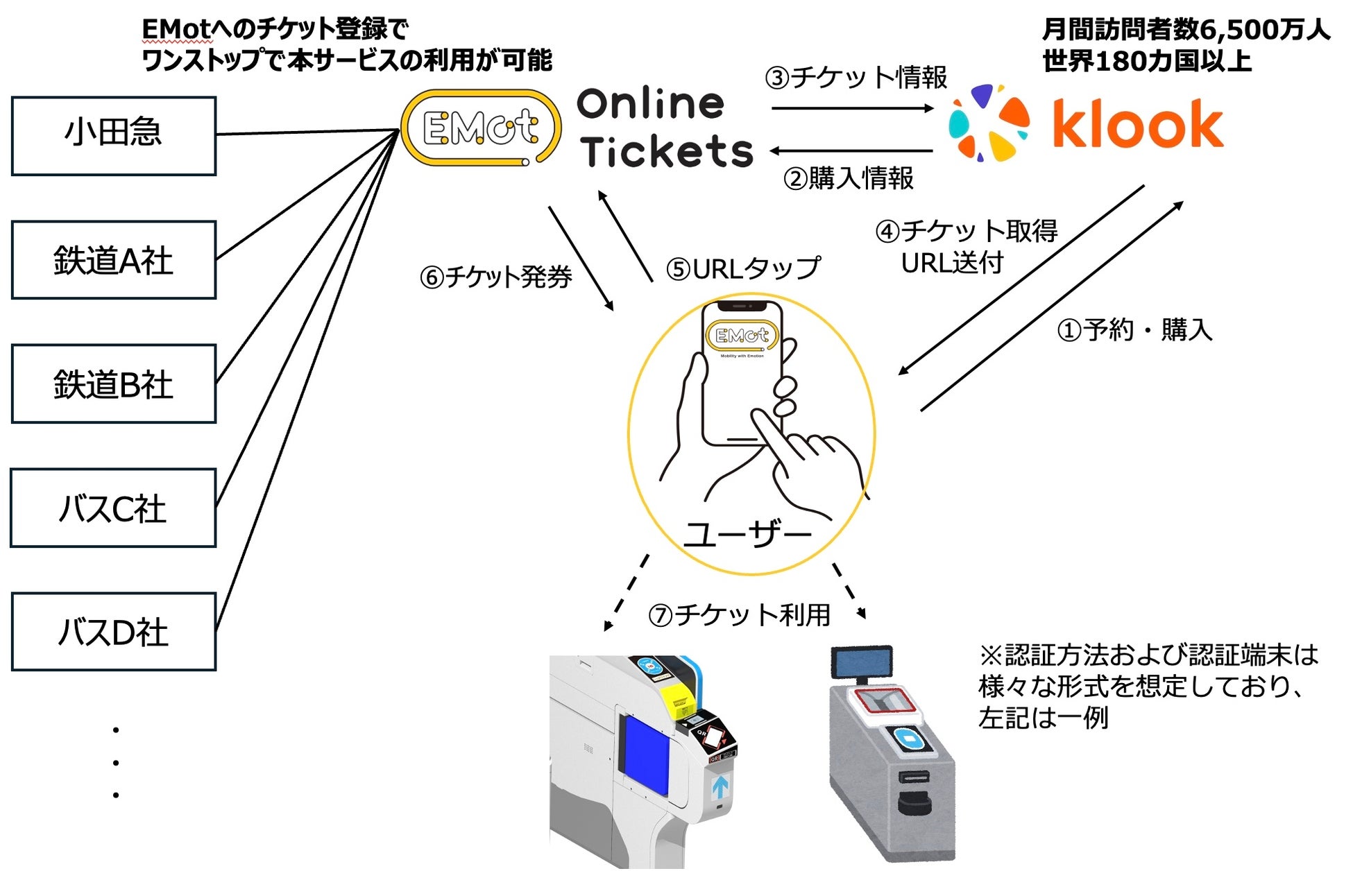 本サービスは、さまざまなタイプの券種や二次元コードも含めた認証方法を取扱うことができるEMotと、月間6,500万人が訪問するオンラインサービスを有するKlookが連携することによって誕生したもので、インバウンド旅行者が自身のスマートフォンのみで、予約・購入・利用まで一気通貫した旅行を楽しめるようになります。事業者は、「EMotオンラインチケット」へのチケット登録のみで、Klookとの契約業務・チケット管理・精算業務が一括して行われるため、手軽に本サービスを利用可能です。小田急電鉄とKlookは、本サービスの連携事業者数を2030年度50社まで拡大することで、インバウンド旅行者がストレスなく旅行できるプラットフォームの構築を目指すともに、事業者側の業務効率向上のサポートを続けていきます。