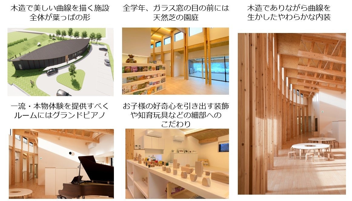 お子様の教育のために「教育移住」をするご家庭が増えている軽井沢町。子育て世代の増加を受け、保育園ニーズが高まっていました。今回誕生した「ポピンズナーサリースクール軽井沢風越」は、軽井沢町で49年ぶりの大型保育園であり、ポピンズ初の長野県内の認可保育所です。1枚の木の葉の形をイメージして作られた建物は木造でありながら曲線を生かしたやわらかな印象を与え、お子様が安心して過ごせるよう内装にもさまざまな工夫がされています。英語やSDGs、ポピンズプラス、オムツ・タオルサービス等、公立園にはない質の高い多種多様なサービス・プログラムを実現。お子様への一流・本物体験を提供すべくルームにはグランドピアノを配置しました。装飾や知育玩具などの細部にもこだわり、お子様の好奇心を引き出して自発的な行動を促す様々なスペースがあります。また、各保育室は広々とした園庭に面しており開放感あふれた空間となりました。
