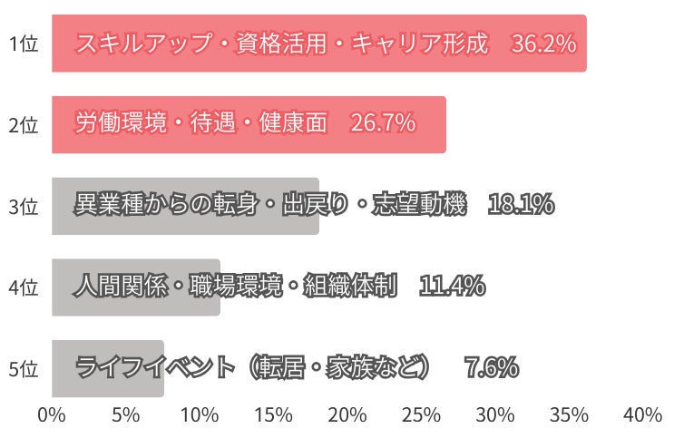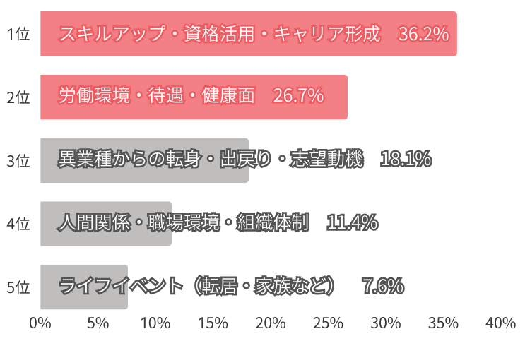 ・2位は「労働環境・待遇・健康面」26.7%。資格を活かしたい思いがあっても、待遇や働き方が見合わず転職を選ぶ実態が浮き彫りに。