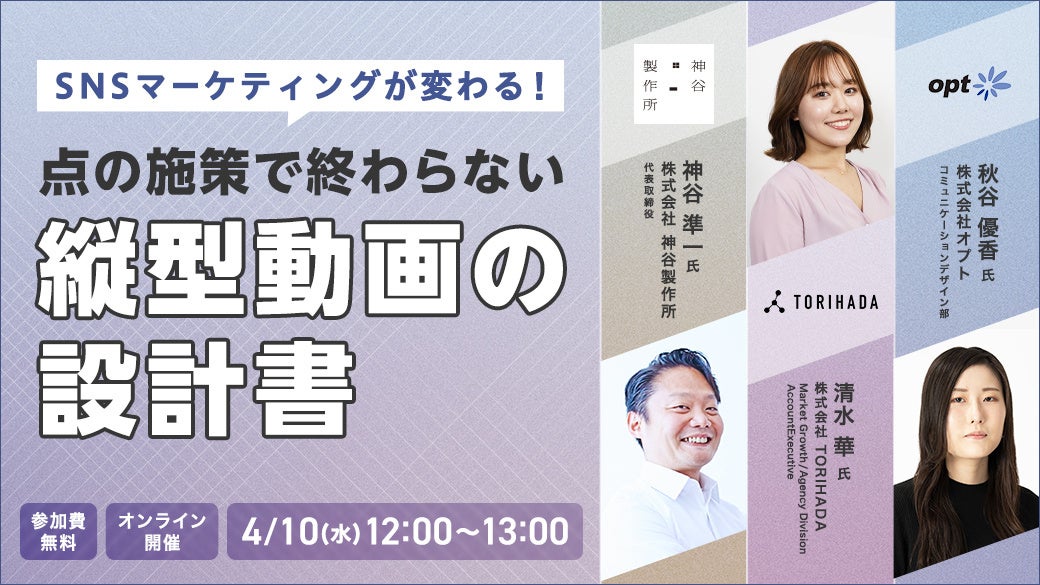 本セミナーでは、近年のトレンドである「縦型動画」をテーマに、数多くのデジタルマーケティング支援を行ってきたオプトと、入浴剤BARTHのブランディング戦略をはじめとした、クリエイティブPRを手がける神谷製作所、そしてSNSマーケティングのノウハウを駆使して、企業のさまざまな課題を解決してきたTORIHADAの3社が取り組む、縦型動画の新たな指針をお話いたします。