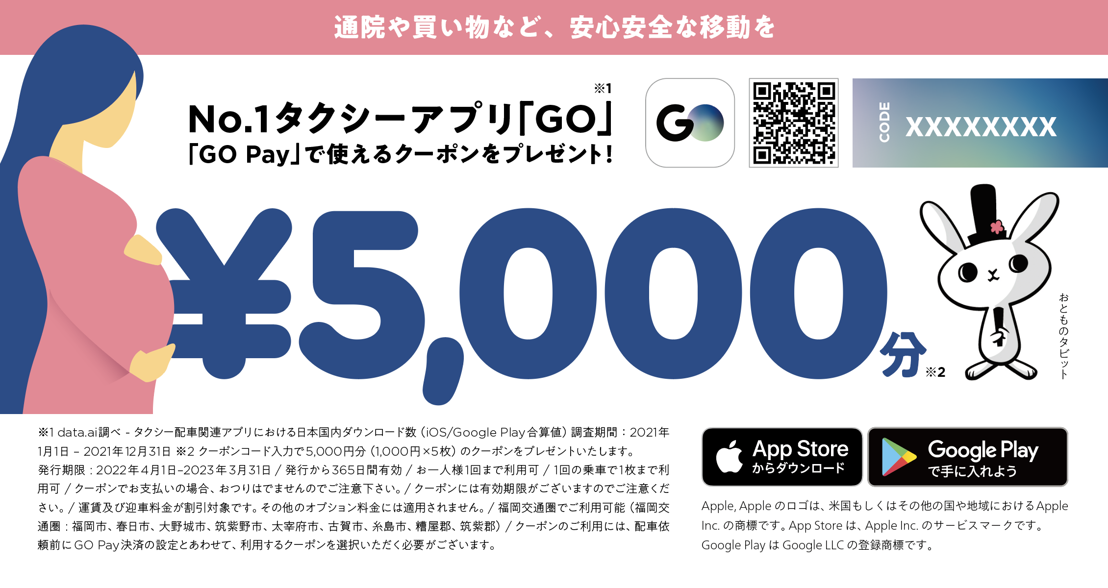 この度開始する『妊産婦タクシーサポート』では、太宰府市にお住まいの妊産婦の方々に対して、母子健康手帳の交付以降、『GO』で使える5,000円分クーポンをお渡しします。クーポンは福岡県内全ての『GO』提携タクシーにおいて使用いただくことができます。通院やお買い物など、日々の移動に活用いただくことで、移動の負担軽減を図ります。