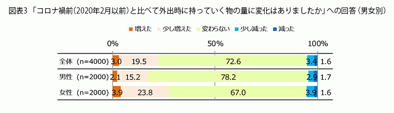 - コロナ禍以降、女性の4人に1人が外出時の荷物が「増えた」