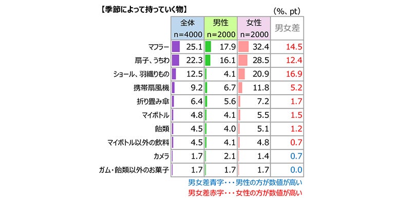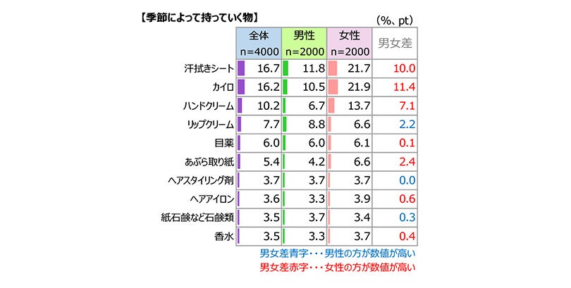 “季節によって持っていく物”では、夏の「汗拭きシート」16.7%と冬の「カイロ」16.2%が僅差で並び、以下、乾燥対策の「ハンドクリーム」「リップクリーム」が続きました。性別トップは、男性が「汗拭きシート」、女性ではわずかに「カイロ」が上回りました。カイロを女性年代別にみると(図表非掲示)、20代が26.7%と男性を含めた全年代で最高であるなど、40代以下で特に高値となりました。冷え対策のほか、おしゃれで薄着をする時などにも使うのでしょうか。