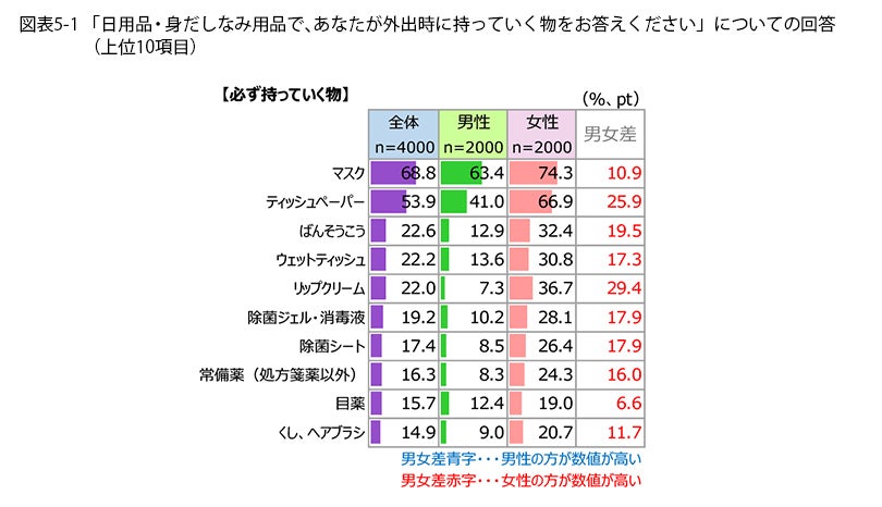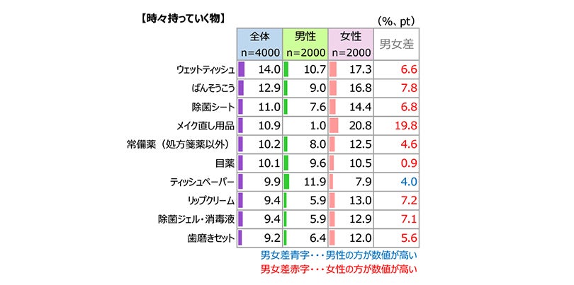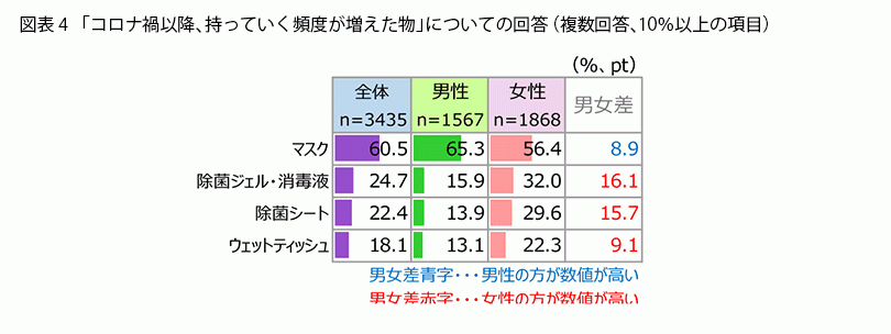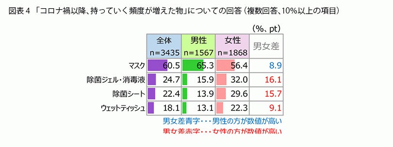 具体的に【持っていく頻度が増えた物】はなにかをみてみると(図表4)、やはり「マスク」が60.5%でトップ。男女別では男性65.3%・女性56.4%と女性のほうが低いのは、コロナ禍前からマスクを持ち歩いていた人が多かった、ということでしょうか。2位以下も「除菌ジェル・消毒液」「除菌シート」「ウェットティッシュ」とコロナ対策品が顔をそろえました。この3アイテムいずれも女性のほうが高率になっており、特に除菌アイテムは液体・シートともに女性が10ポイント以上上回りました。外出時も女性はコロナ対策に余念がないようです。