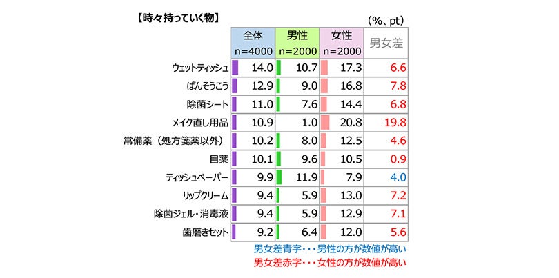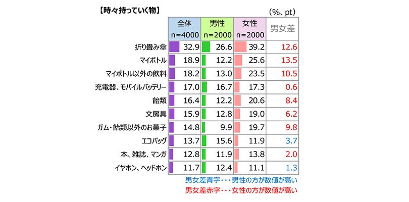 “時々もっていく物”では、男女ともにトップは「折り畳み傘」に。天気予報で雨マークがあったら出がけにバッグに入れる、ということなのでしょう。以下、「マイボトル」などの飲料、「充電器、モバイルバッテリー」など、外出の目的や移動距離に応じたアイテムが上位に並びました。