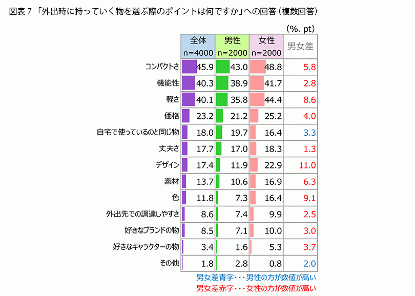 男女別では、男女とも「コンパクトさ」がトップというのは共通ですが、これ以下をみると、男性は2位「機能性」、3位「軽さ」なのが、女性では両者が逆転しています。図表2でみたように、女性は男性より荷物が多い傾向があるうえ、男性に比べて体格が小さいことから、荷物の重さを抑える点からも“小さくて軽い”アイテムを選ぶ傾向が強いのかもしれませんね。また、「デザイン」も女性は22.9%と男性を11ポイント上回るほか、「素材」「色」がともに16%台、「好きなブランドの物」も10%であることからも、アイテムの“見た目”を含めて女性は男性に比べて“こだわり”が大きいことがうかがわれます。