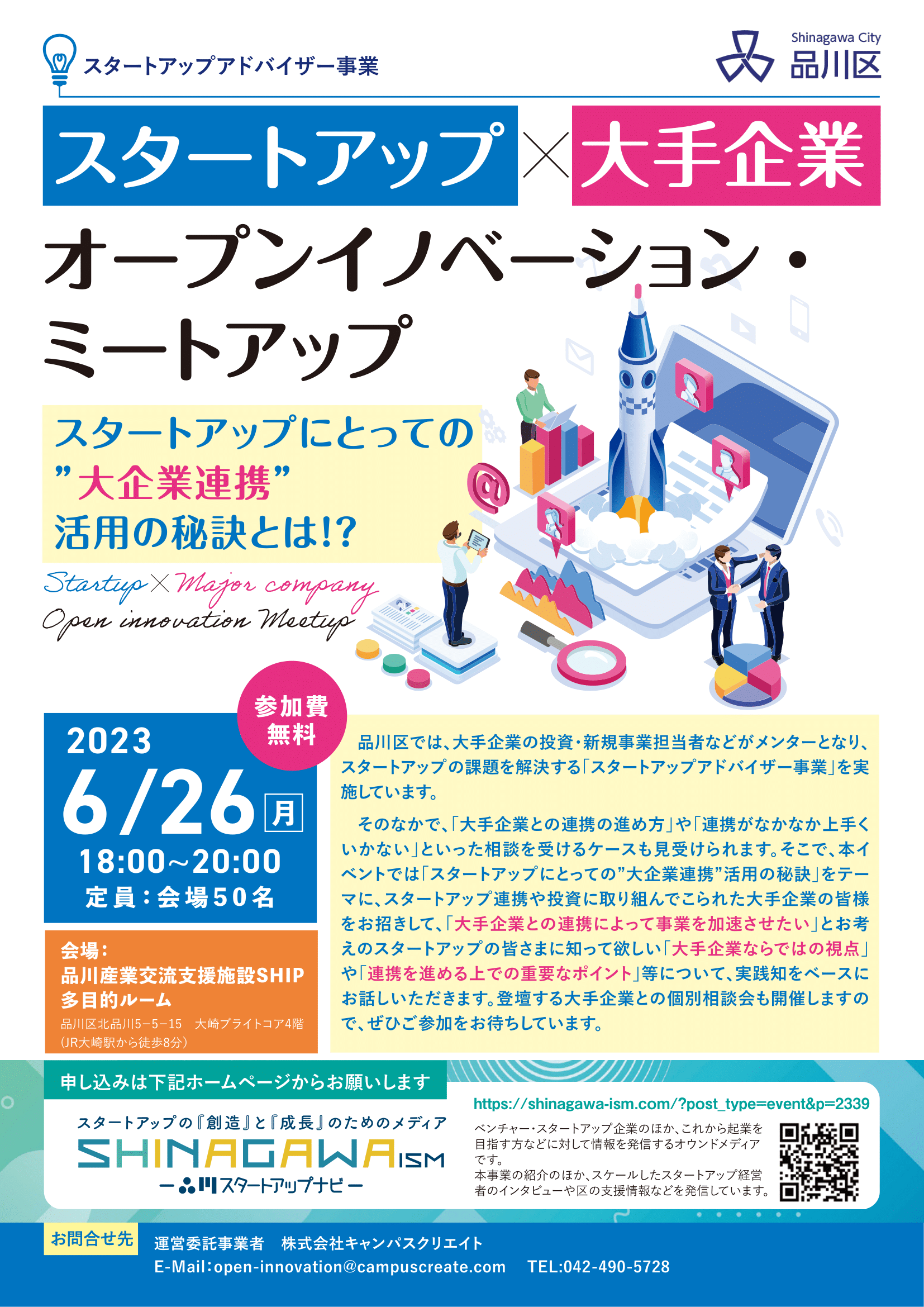 品川区は2023年6月26日に『スタートアップ×大手企業 オープンイノベーション・ミートアップ〜スタートアップにとっての”大企業連携” 活用の秘訣とは!?〜』を開催します。是非ご参加ください。