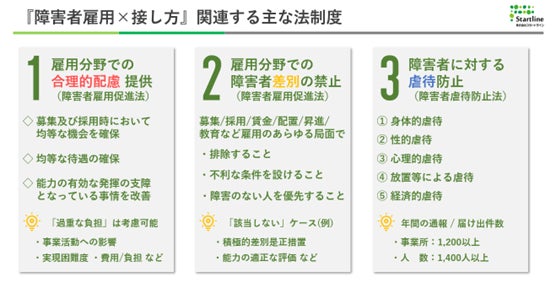 第2部では、当社のマーケティングユニット障害者雇用エバンジェリストの吉田が登壇し、障害者就労支援の現場で得られた知見をもとに、雇用分野における具体的事例を用いた合理的配慮について講演しました。関連した法制度には、障害者雇用促進法における「合理的配慮の提供」「障害者差別の禁止」そして、障害者虐待防止法における「虐待の防止」などがあります。雇用する障害者一人ひとりの異なる障害特性を踏まえ、あらゆる場面で合理的配慮の提供を行うためには、各法制度を正しく理解する多くの時間を要します。