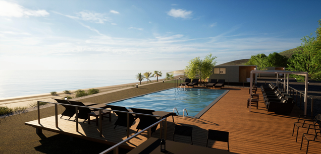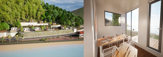 本事業予定地の片添ヶ浜には西日本有数の青い海と美しい白砂の海水浴場があり、瀬戸内海国立公園内に位置しております。豊かな自然・緑に囲まれた浜辺は総延長約 1.2km におよび、浜辺一帯には、ヤシの木が立ち並んでおり、附帯施設等においても周辺の自然環境とよく調和しています。南国をイメージさせる開放的なその景観とゆとりあるスペースは人々に潤いを与え、心身のリフレッシュや憩いの場となっております。施設内にインフィニティプールとテラスを設置し、泳ぐことは勿論のこと、テラス席で海を眺めながらカフェを楽しむこともできます。アクティビティについては、SUP・シーカヤック・パドリング・釣り・サイクリングなどのマリンアクティビティがあることに加え、海の幸が豊富な周防大島島内の食材を使った魅力的な食体験を楽しむことができるとともに、地域への経済波及効果を重視しています。