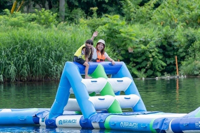 そんな「ポチャダス」は、子供から大人まで楽しめるアクティビティで今シーズンよりウォーターフロートを11アイテム増設、総面積約2倍にパワーアップ!特に、4歳から楽しめるため、家族全員での参加が可能で、まるで雲の上を歩いているかのような感覚を味わえます。ウォーターフロートの上では、浮遊感を楽しみながら体を動かすことができ、スリリングな体験が待っています。特に、ウォーターフロート間の移動や、浮遊する遊具での遊びは、スリル満点で魅力的です。