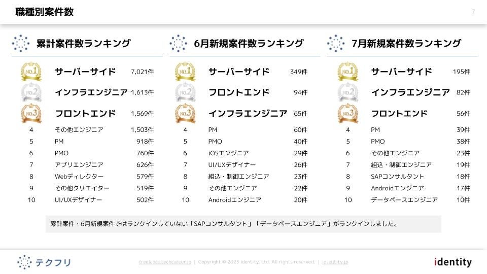 ・職種別案件数において、累計案件・6月新規案件ではランクインしていない「SAPコンサルタント」「データベースエンジニア」がランクインしました。