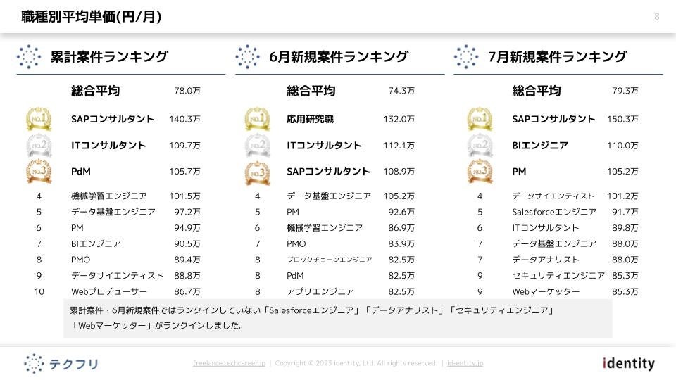 ・職種別平均単価において、累計案件・6月新規案件ではランクインしていない「Salesforceエンジニア」「データアナリスト」「セキュリティエンジニア」「Webマーケッター」がランクインしました。