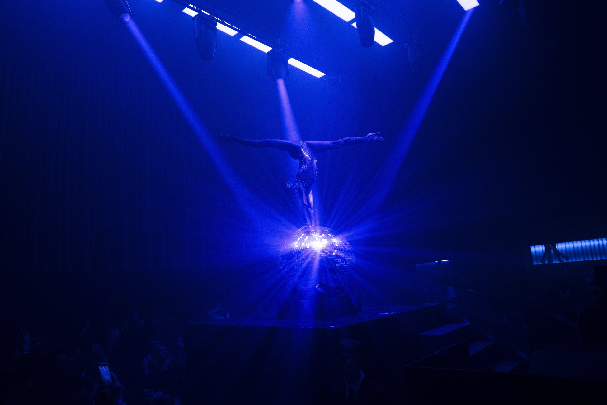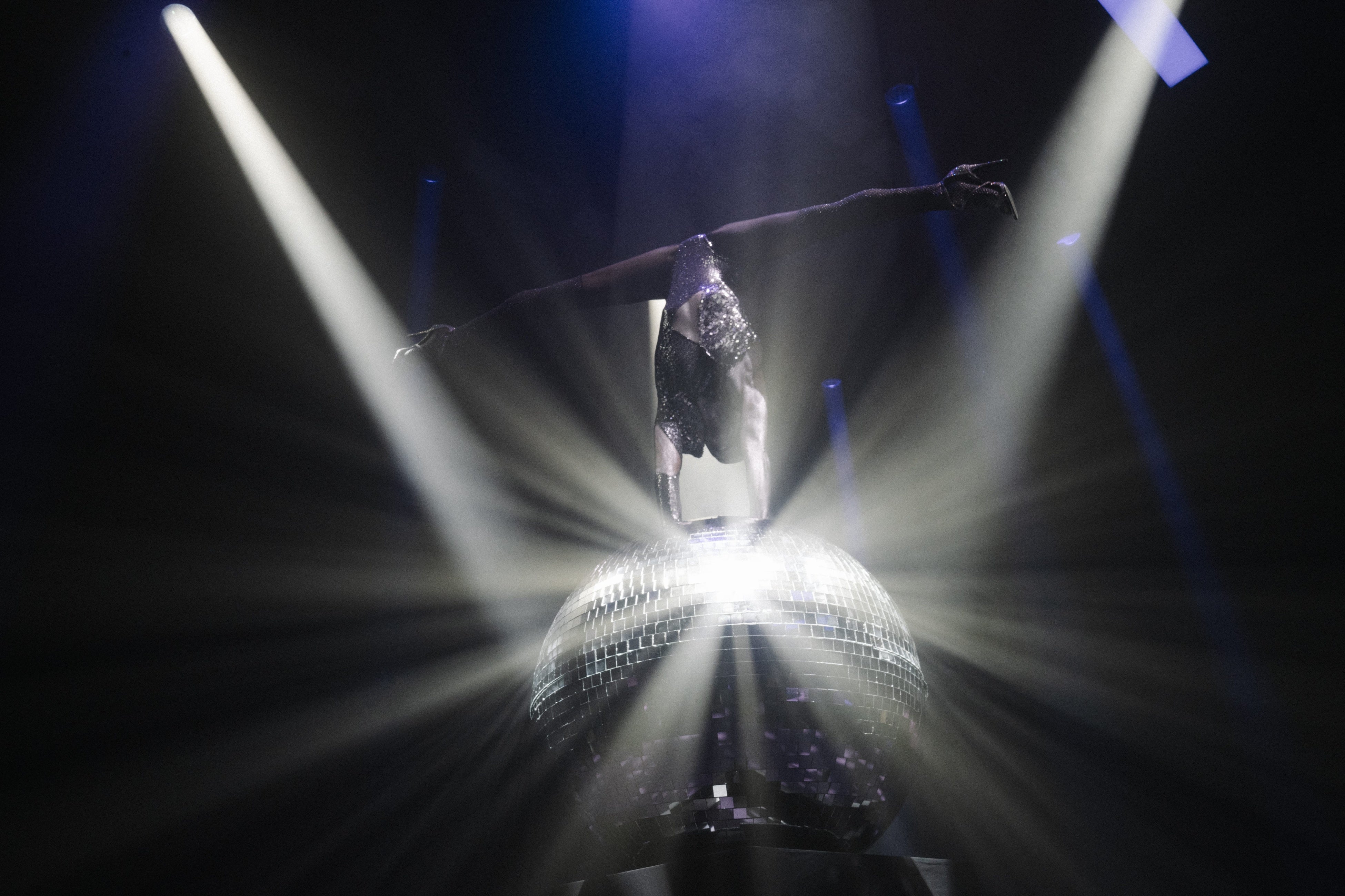 ミラーボールのまわりを踊る「ミラーボール・パフォーマー」ルイーズ・ケリーが登場し、来場者を魅了しました。