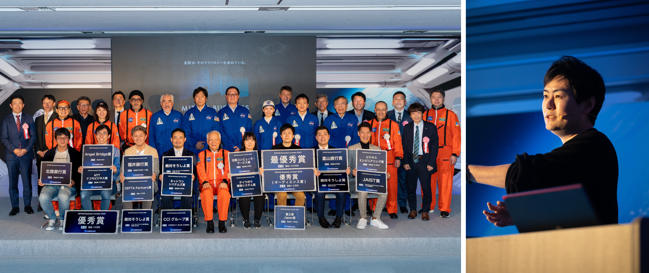 最優秀賞と優秀賞(オーディエンス賞)をW受賞したのは、AIを活用した放射線治療計画ソフトウェアを独自開発するアイラト株式会社の角谷 倫之氏でした。石川県出身の角谷氏が共同代表取締役を務める同社は、放射線治療ですべてのがん患者を救うことをミッションに掲げる、東北大学医学部発のスタートアップです。また、電気味覚デバイスを研究開発する株式会社UBeingの代表取締役CEOで現役医師でもある福島 大喜氏が優秀賞を受賞しました。その他、協賛企業14社からの協賛企業賞がそれぞれ授与されました。