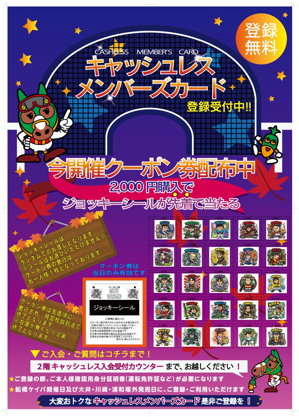 開催期間中キャッシュレスで2,000円以上の馬券を購入されたお客様に、船橋競馬限定のジョッキーシールが先着で当たります。是非シールコンプリートを目指しましょう!