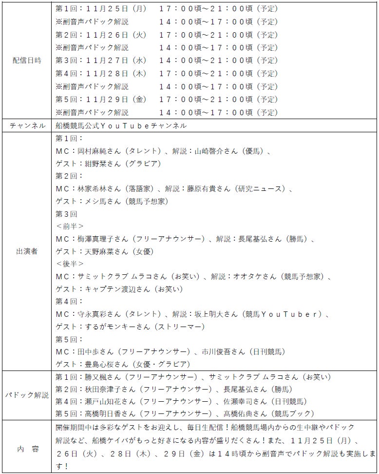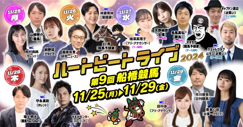船橋ケイバでは、令和6年度第9回開催を11月25日(月)~11月29日(金)に開催いたします。今開催では、「船橋記念(SⅢ)」を開催いたします。また、お子様と一緒に楽しめる「キャロッタグリーティング」や競馬ビギナーの方が楽しく学べる「ビギナーズサポート」などのイベントを実施いたします。11月も船橋ケイバをお楽しみください!!