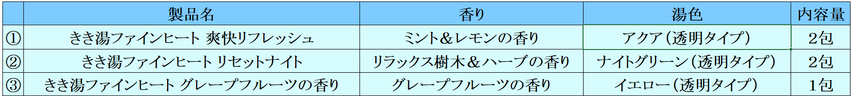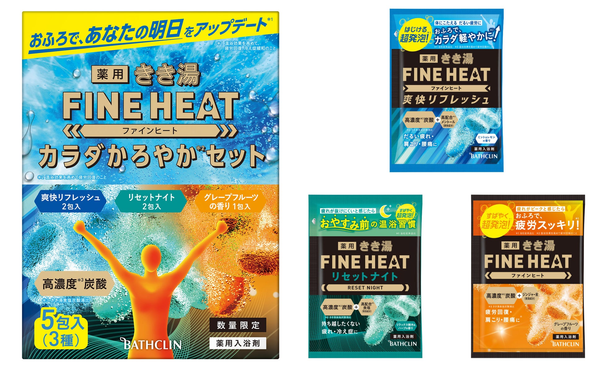 汗ばむ季節を元気に過ごしていただきたいという思いから、積極的に健康増進に励む生活者をサポートする「きき湯ファインヒート」シリーズより、3種類のアイテムを詰め合わせた「カラダかろやか*1セット」を数量限定で発売いたします。
