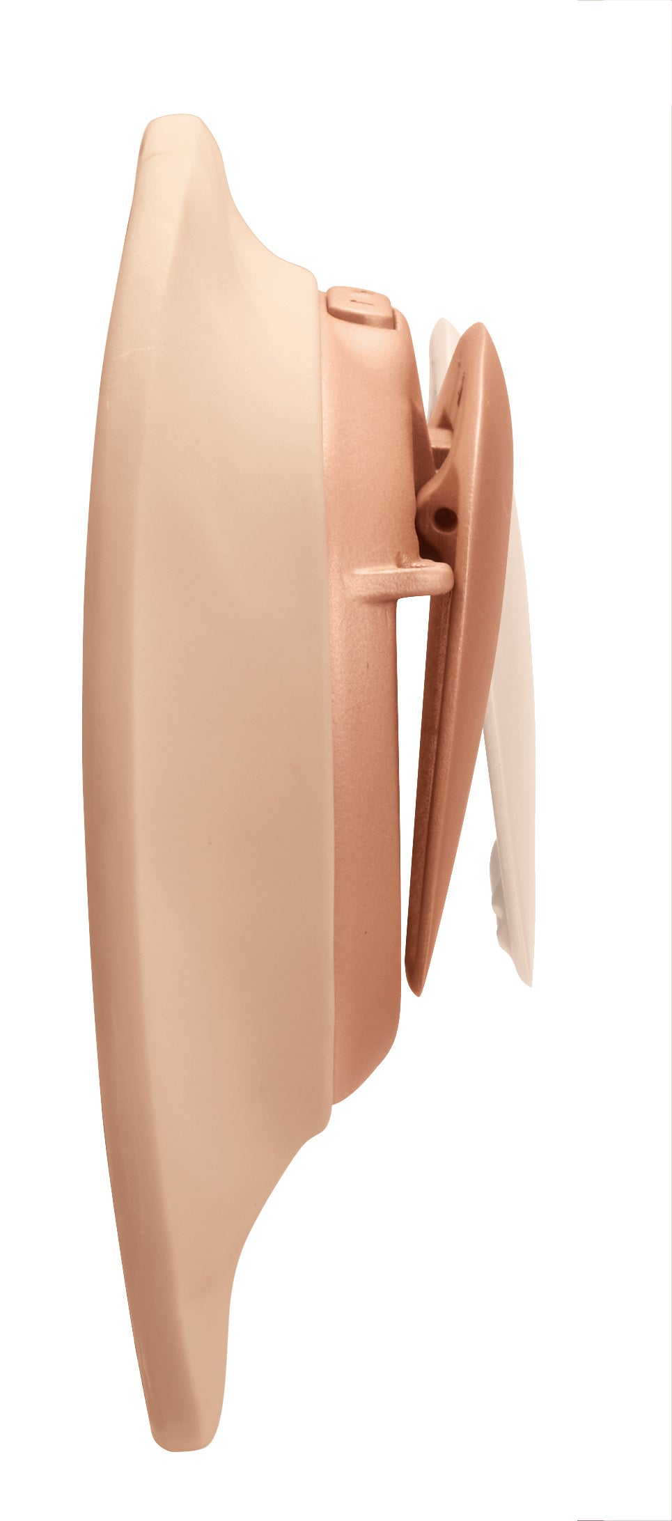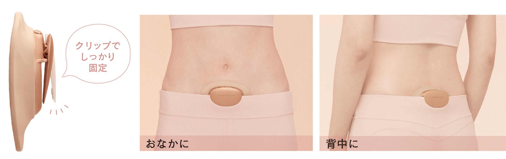 使用時は本体のクリップをショーツに挟んで固定します。体に触れる部分はゆるやかなカーブに設計し、おなかや背中にぴったり沿います。服の上からでも目立ちにくい3cmの薄さです。