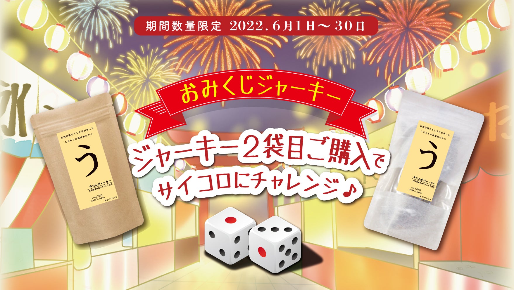 このたびの『おみくじジャーキー』は、当社の大人気牛たんジャーキー各種から、お好きなジャーキーを2袋以上ご購入されたお客様が対象となっており、サイコロの出た目の合計に合わせて、お得にジャーキーを購入できる企画となっております。ゾロ目が出た場合は、2袋目を無料でプレゼントいたします。その他合計の目によって、お得にジャーキーを購入することができます。