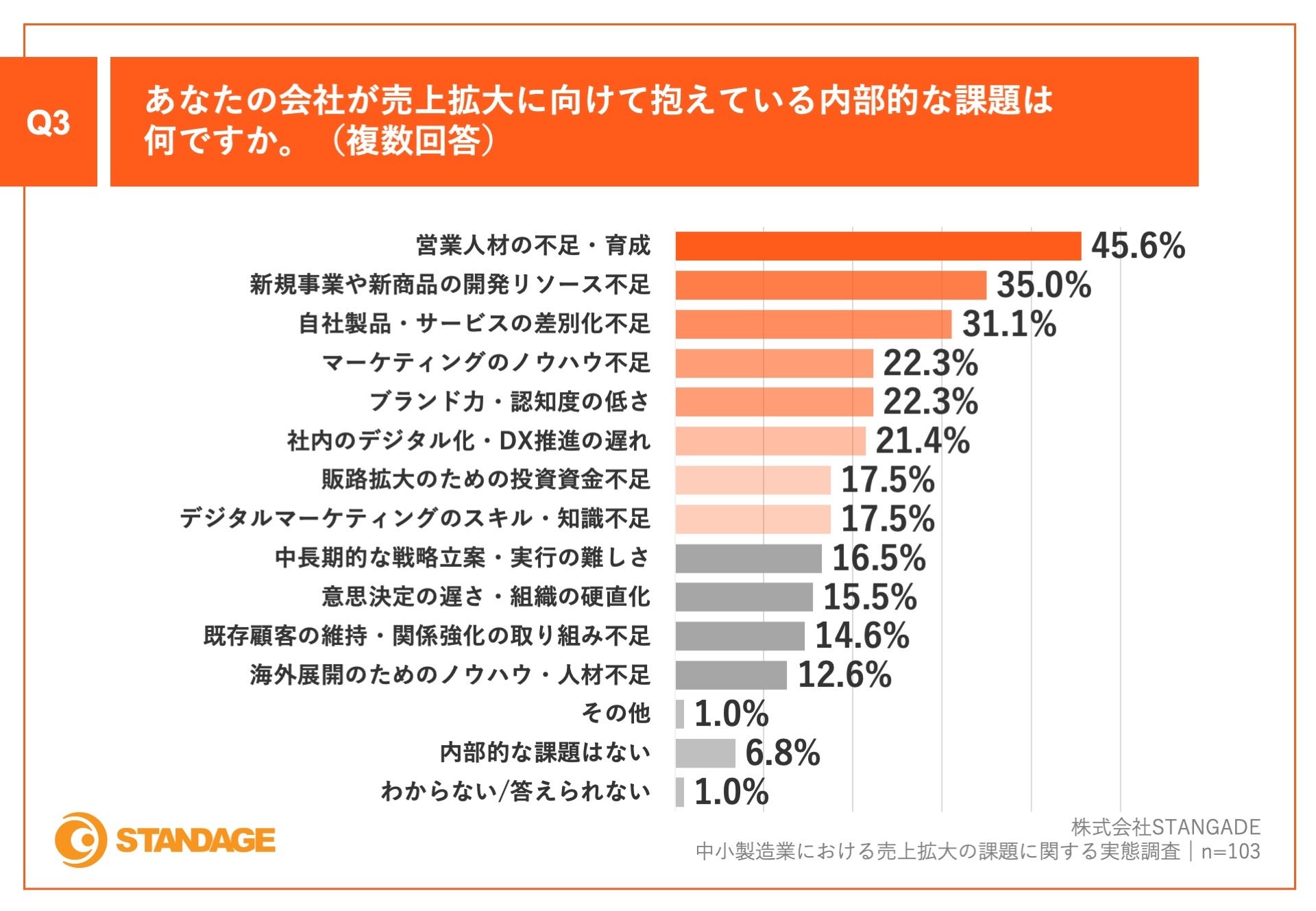 「Q3.あなたの会社が売上拡大に向けて抱えている内部的な課題は何ですか。(複数回答)」(n=103)と質問したところ、「営業人材の不足・育成」が45.6%、「新規事業や新商品の開発リソース不足」が35.0%、「自社製品・サービスの差別化不足」が31.1%という回答となりました。