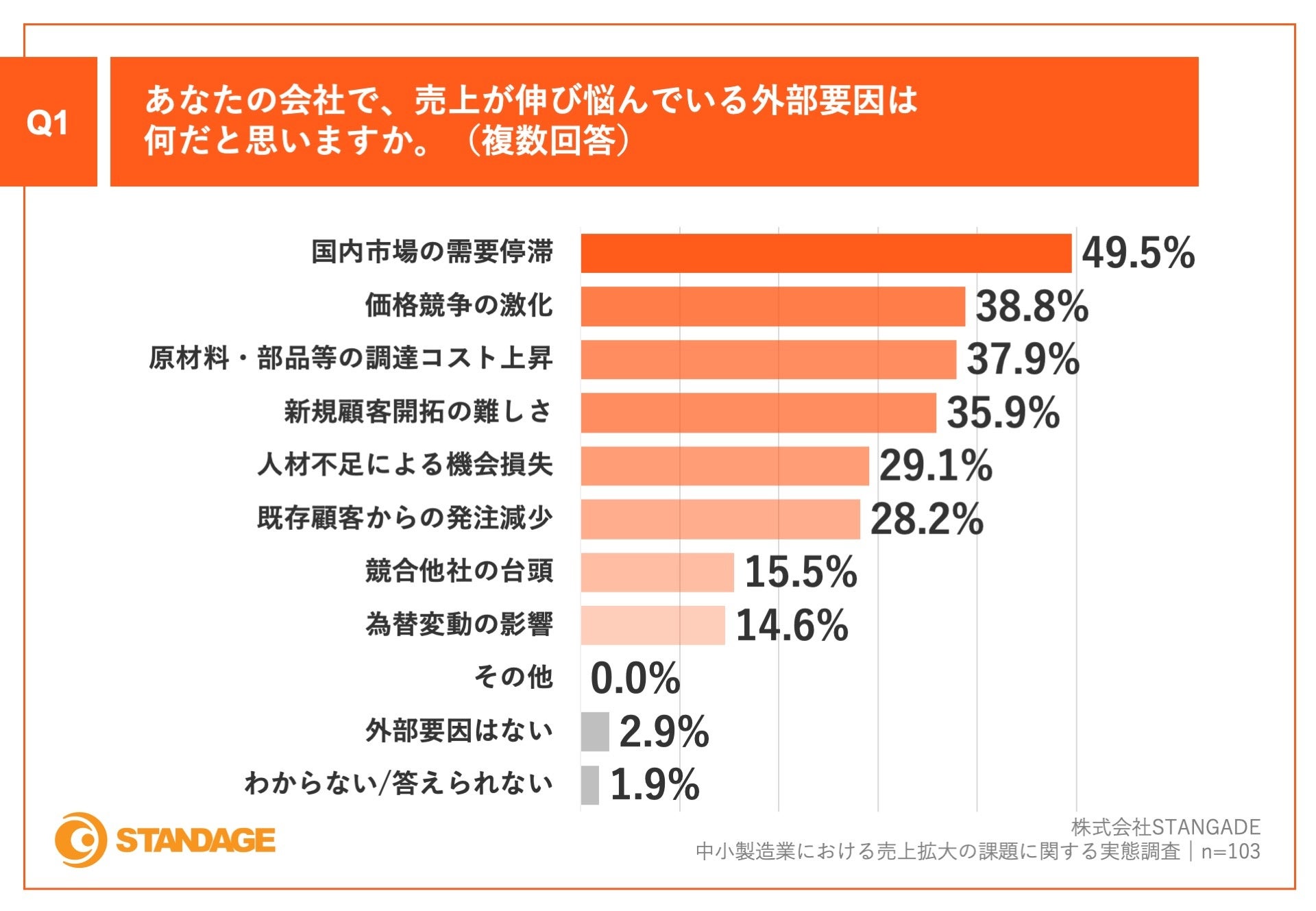 「Q1.あなたの会社で、売上が伸び悩んでいる外部要因は何だと思いますか。(複数回答)」(n=103)と質問したところ、「国内市場の需要停滞」が49.5%、「価格競争の激化」が38.8%、「原材料・部品等の調達コスト上昇」が37.9%という回答となりました。