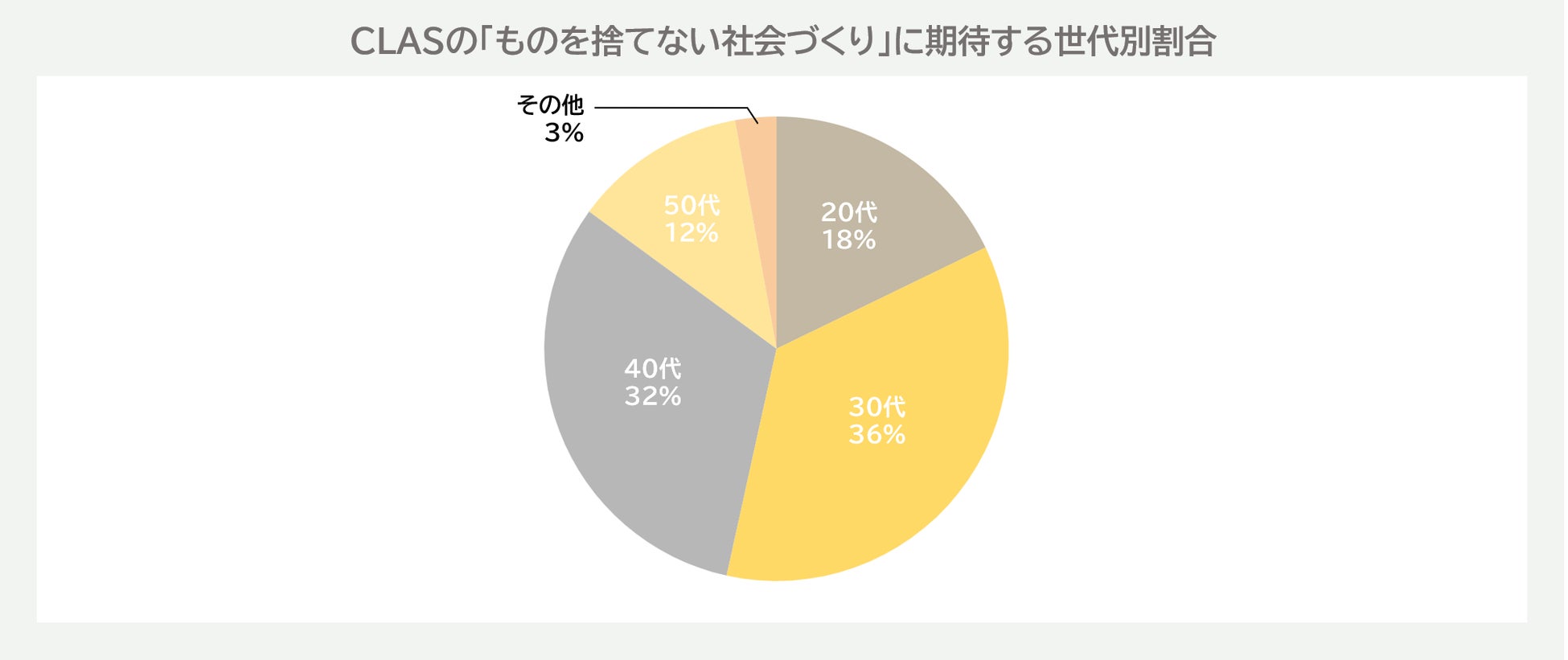 CLASの「ものを捨てない社会づくり」に最も期待する世代は30代が最多の36%、次いで40代の32%となり、幅広い世代に支持されています。