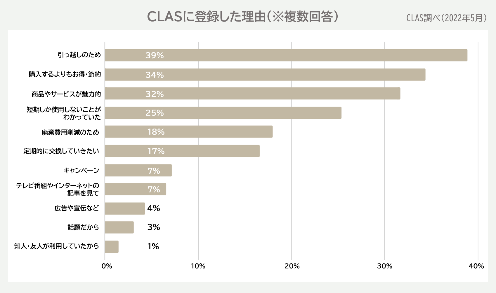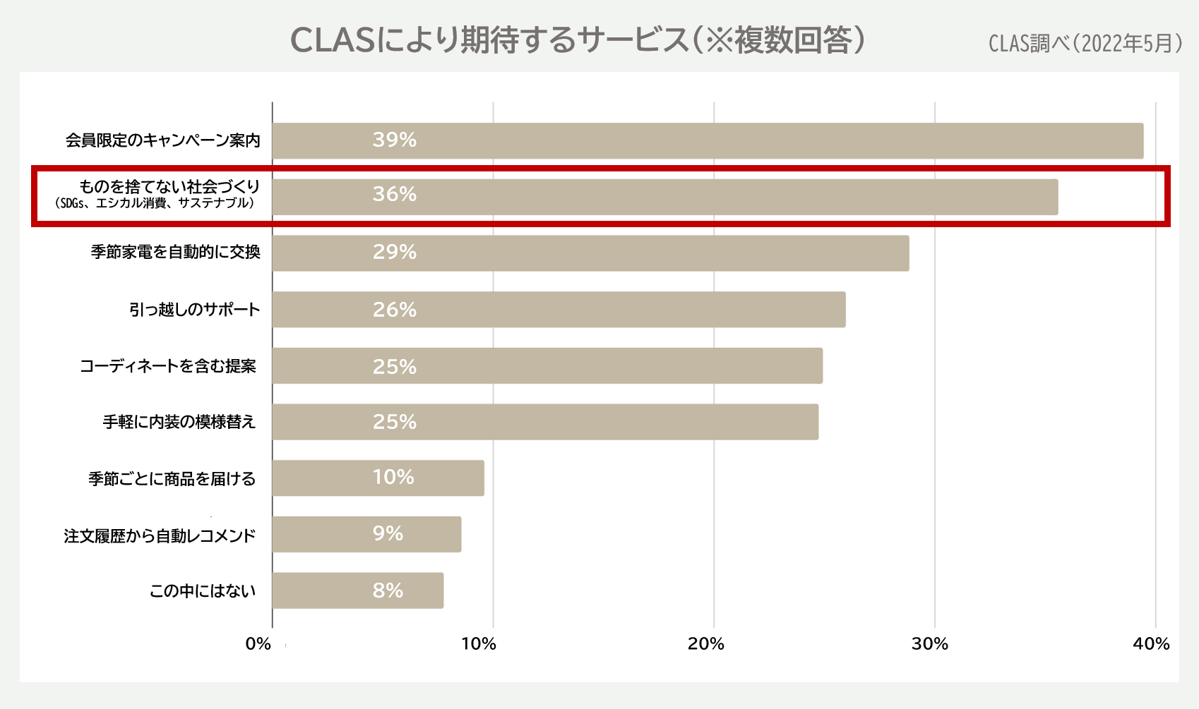 「“暮らす”を自由に、軽やかに」をビジョンに掲げる株式会社クラス(本社:東京都目黒区、代表取締役社長:久保裕丈、以下「CLAS」)は、「“暮らす”を着替える」をコンセプトとした家具・家電のサブスクリプションサービス「CLAS(クラス)」において、5月30日「ごみゼロの日」にちなんで登録者を対象にWebアンケート調査を実施した結果、登録者の約4割がCLASの目指す「ものを捨てない社会づくり」実現に期待していることがわかりました。