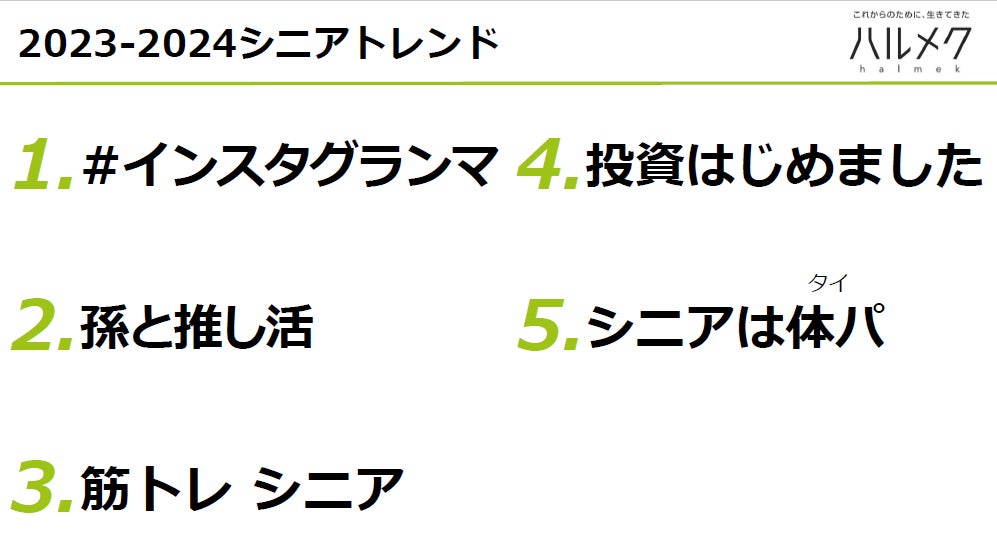 ハルメク 生きかた上手研究所は、シニアの調査・分析を行い、主にシニア女性のインサイトを発掘しています。長かったコロナ禍が終息を迎え、4年ぶりの○○が多く世に溢れた2023年。今、シニア世代はどういったモノに関心があるのか、どういった価値観を重視するのか、これからどのように過ごしたいと考えているのか。シニア世代のリアルな今を明らかにするため、2023-2024シニアトレンドを発表しました。