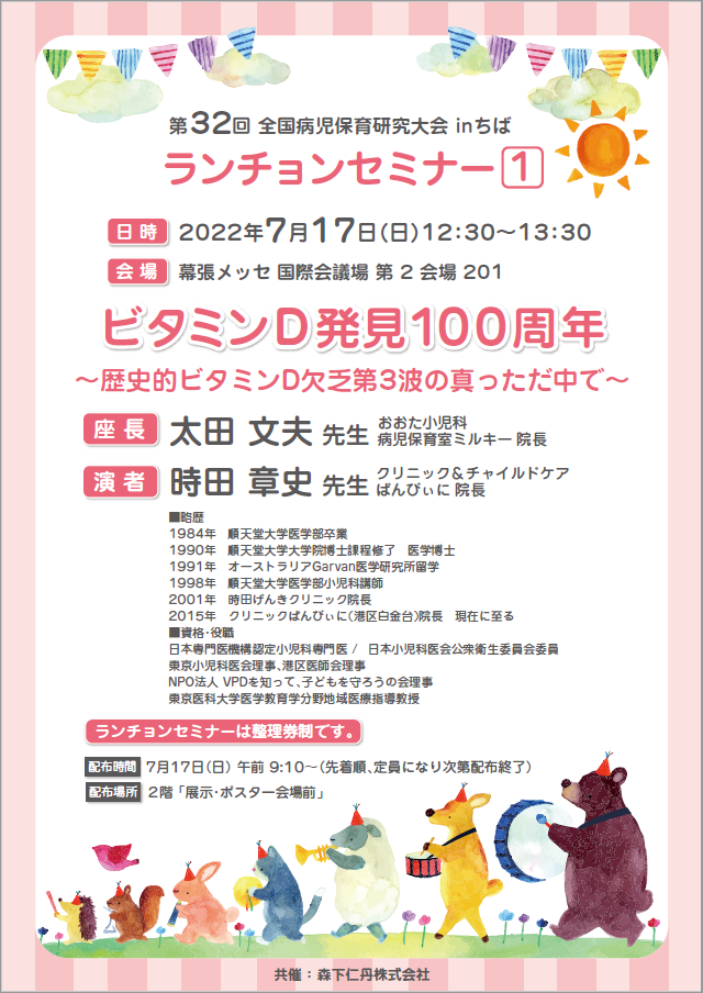 森下仁丹株式会社(本社:大阪市、代表取締役社長 森下雄司)は、2022年7月17日~18日まで幕張メッセ国際会議場で開催される「第32回全国病児保育研究大会inちば(主催 一般社団法人全国病児保育協議会)」にてブース出展し、ランチョンセミナー「ビタミンD発見100周年~歴史的ビタミンD欠乏第3波の真っただ中で~」を共催いたします。