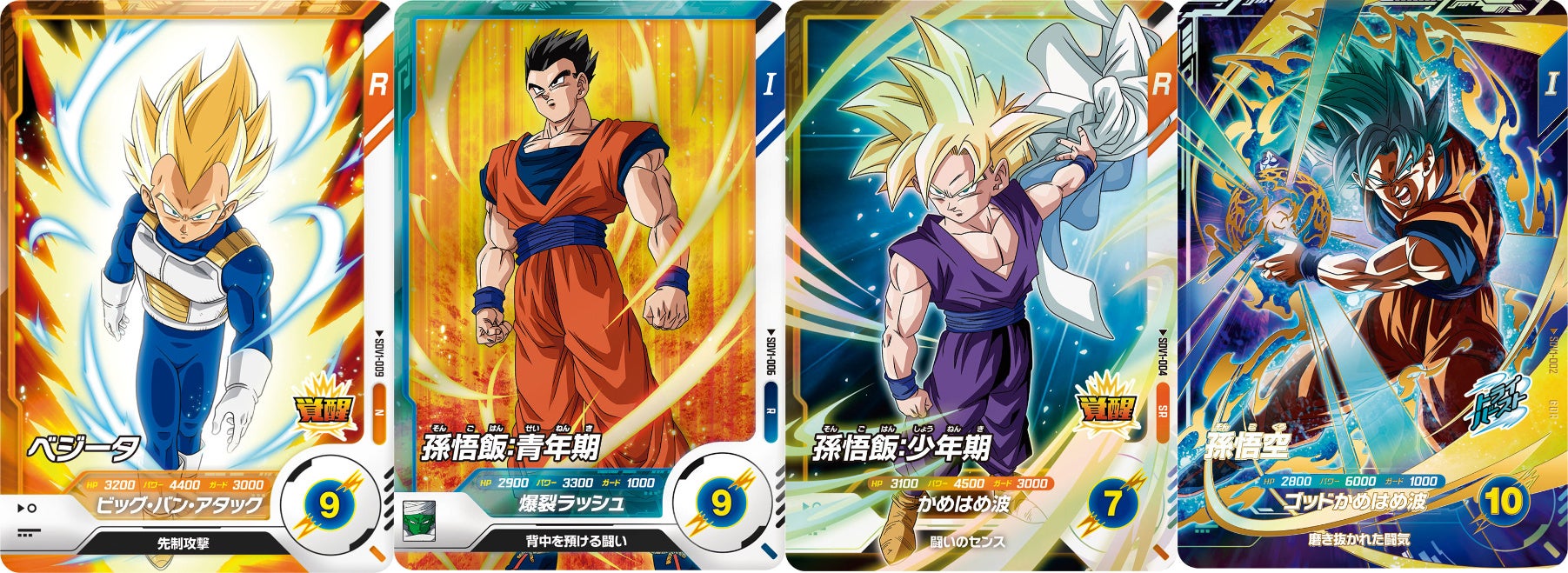 左から、ノーマル(N)、レア(R)、スーパーレア(SR)、ゴッドレア(GDR)