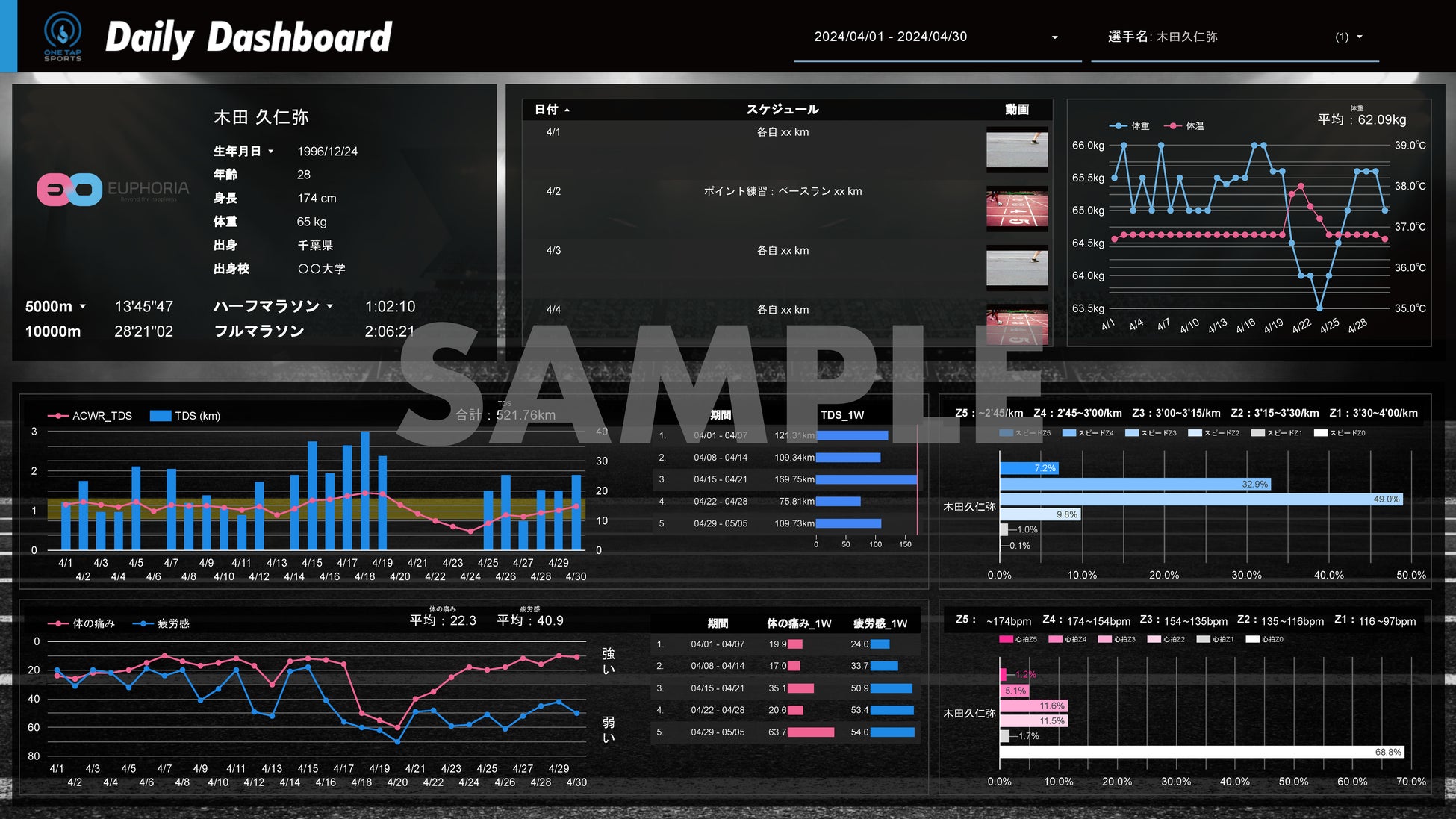 ユーフォリアが2013年より開発・提供を手掛けるONE TAP SPORTSは、日本代表やプロ、中/高/大学部活動など幅広いアスリート向けにケガ予防やコンディション管理、パフォーマンス分析のためにさまざまな情報を一元管理するデータマネジメントシステムです。