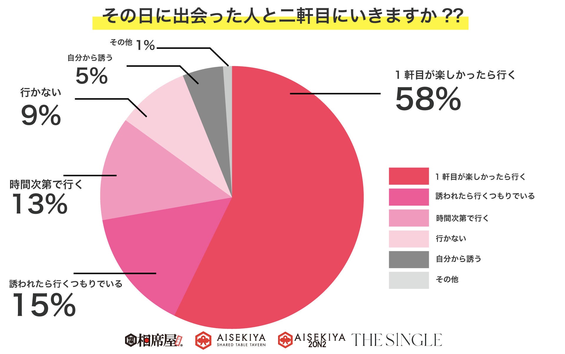 また、実際にこれまでどのくらいの確率で二軒目に行ったかを聞いたところ、行かないと答えた人は8%、1~25%が24%、26~50%が39%、51%~75%が22%、76~100%が7%という結果となりました。