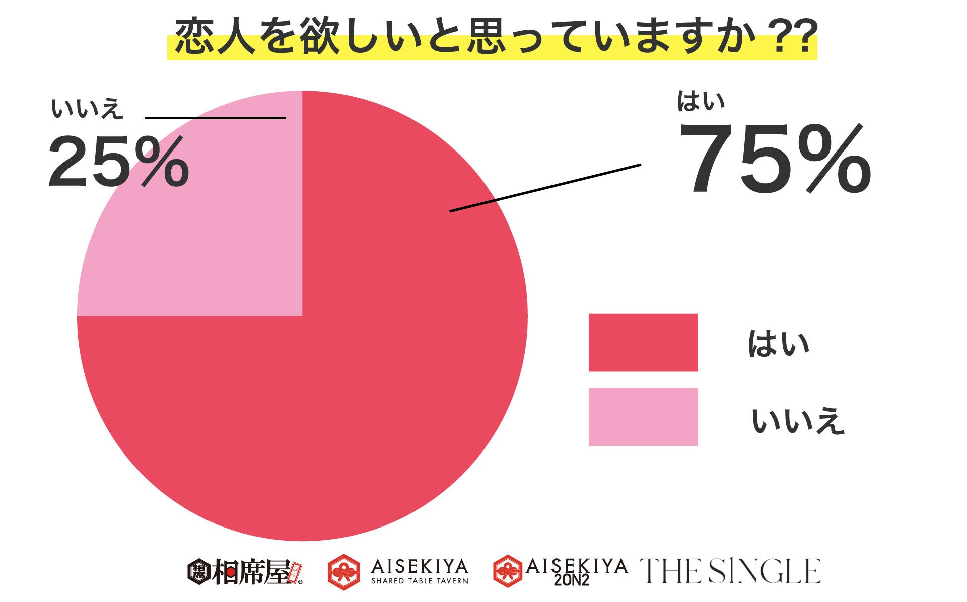 また、回答者で未婚または恋人がいない男女に絞って「恋人をほしいと思っていますか?」と聞いたところ、75%が「はい」と回答。「いいえ」と答えた25%の中には、「1人の方が楽」、「今は恋人より友達を作りたい」、「面倒」といった回答が多く、出会いは求めているもののそれが必ずしも恋愛に繋がらなくてもいいという人が多いことがわかりました。