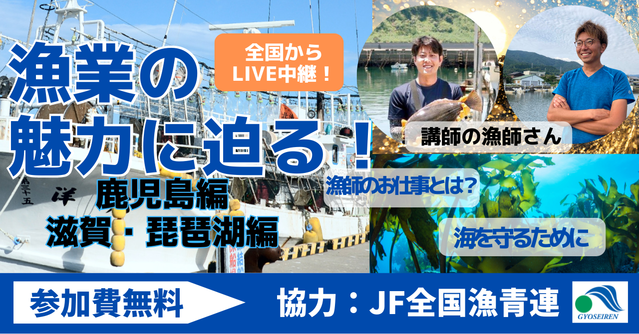 今回は現地鹿児島や、滋賀・琵琶湖から漁師さんがライブ中継で授業を行い、漁業の魅力や、漁師さんのお仕事の様子、事前に郵送したカンパチやビワマスの調理実習など盛りだくさんの内容になっております。授業に参加した子ども達には、「魚についてもっと知りたい!」「漁師さんのお仕事ってかっこいい!」などの興味を持ってもらいたいと考えています。 また漁師さんや魚の魅力を知ることができるプログラムを実施する予定です。