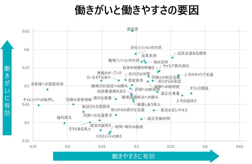 それぞれの要因を散布図で見てみると、オフィス・上司の誠実さ・適正労働時間のような環境面は”働きやすさ”傾向が強く、達成感・ミッション共感・成長実感・強み活用などが”働きがい”傾向が強いことが推測できます。