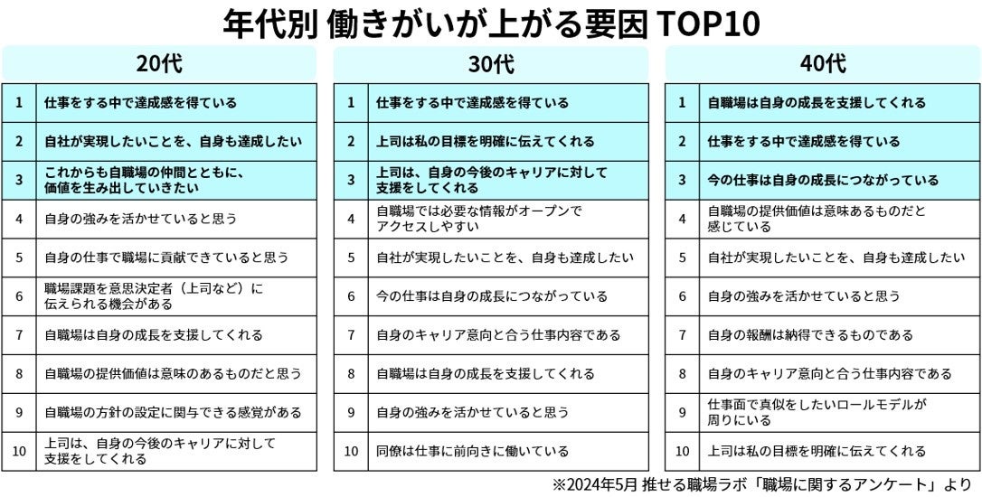 働きがいがあがる要因ランキングを、年代別でも集計。20代・30代で最も高かったのは「仕事をする中で達成感を得ている」、40代で最も高かったのは「自職場は自身の成長を支援してくれる」となりました。年代ごとに、特徴が少しずつ異なることが分かります。
