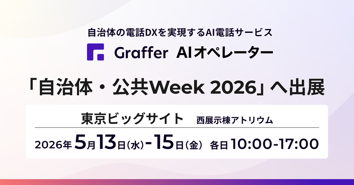 自治体の業務変革を実現する株式会社グラファー(本社:東京都渋谷区、代表取締役:石井大地、以下「当社」)は、2026年5月13日(水)~15日(金)に東京ビッグサイトで開催される「自治体・公共Week 2026」に出展します。当社ブースでは、「電話がつながらないという住民の不満を解消したい」「電話対応の業務負担を減らしつつ住民サービスの質を向上させたい」といった課題を持つ自治体に向けた解決策を提示。メイン展示として、住民の自然な発話を理解し、自治体ごとの参照情報(ナレッジ)をもとに回答するAI電話サービス「Graffer AIオペレーター」を紹介します。ブース内では、サービスのデモ体験や、自治体への導入・活用に関する個別相談会を実施します。