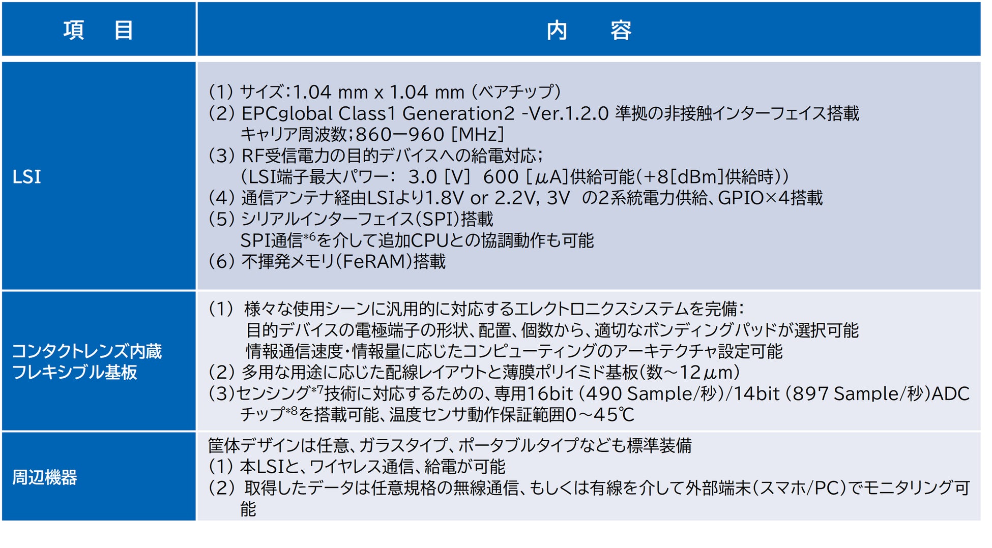 プラットフォームのアーキテクチャは、1.04mm角のLSIチップ(RAMXEED社による設計委託)を中核部品として採用しています。このLSIは、RFID技術*2を使用したレンズと非接触の周辺機器とレンズ間の通信、センサなどの複数部品を制御することが可能です。センサを搭載する際に、16ビットADC(アナログ-デジタルコンバータ)チップを搭載することも標準としています。 またLSIのprimary/standby*3構成によるCPUを内蔵することも可能です。