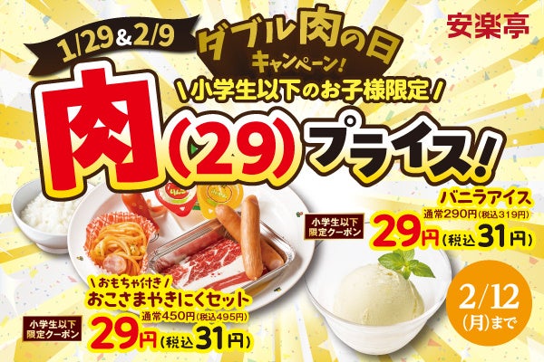 「ダブル肉の日」では、昨年多くのお客さまから大反響をいただきました「おこさまやきにくセット」29円(税込31円)が再登場!また、安楽亭の人気焼肉をたっぷりお得に味わっていただけるようお得なメニューも拡大。人気焼肉の「上タン塩」や「黒毛和牛カルビ」など、なんと4品の半額クーポンを大放出!小学生以下のお子さま向けには他にも「バニラアイス」29円(税込31円)など、ちびっこが大好きなメニューも追加した、特別29(にく)プライスの4商品が登場します。