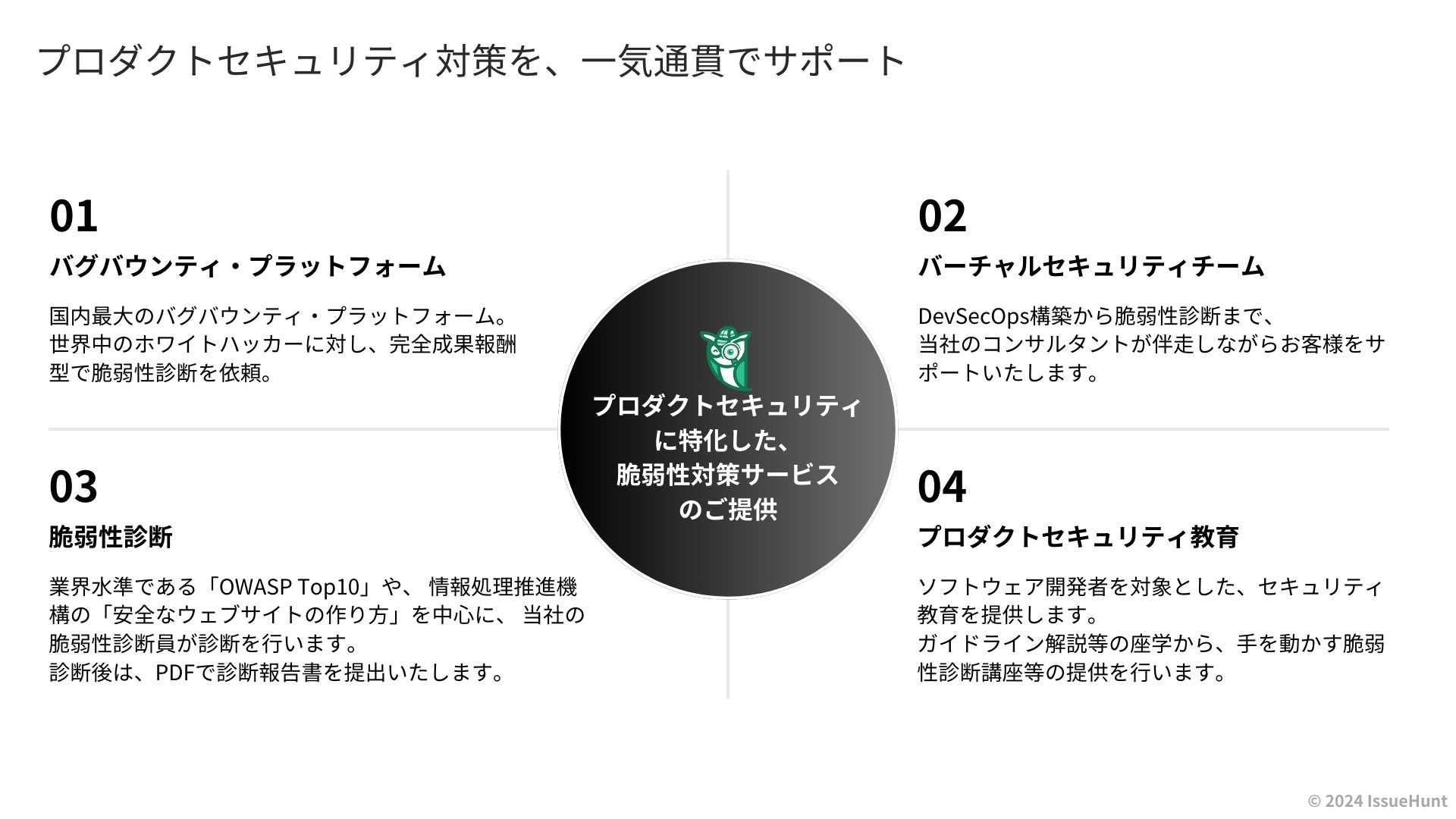 IssueHunt株式会社は、ミッション「才能と機会の媒介になり、全てのクリエイターの努力や貢献が報われる経済圏を作ること」、ビジョンである「日本のサイバーセキュリティのレベルを一段階引き上げる」を実現するために、バグバウンティ・プラットフォーム「IssueHunt」や、バーチャルセキュリティチーム等の提供を行っています。