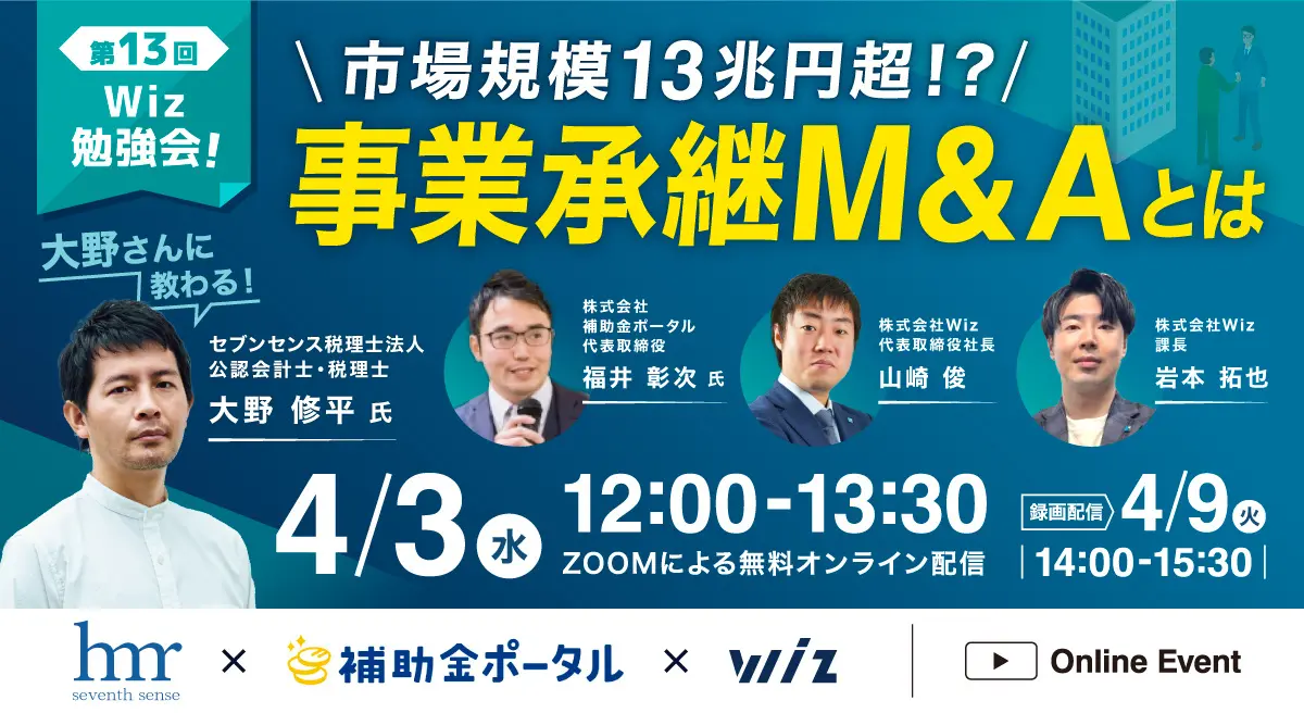 《4/3(水) 事業承継型M&A勉強会》市場規模13兆円超!?事業承継問題にお悩みの経営者様、必見です!