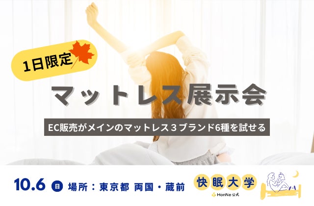 【10月6日(日) 東京都 両国・蔵前】EC販売がメインのマットレス3ブランド6種を試せる一日限定の展示会!YouTubeチャンネル「快眠大学【HonNe公式】」主催