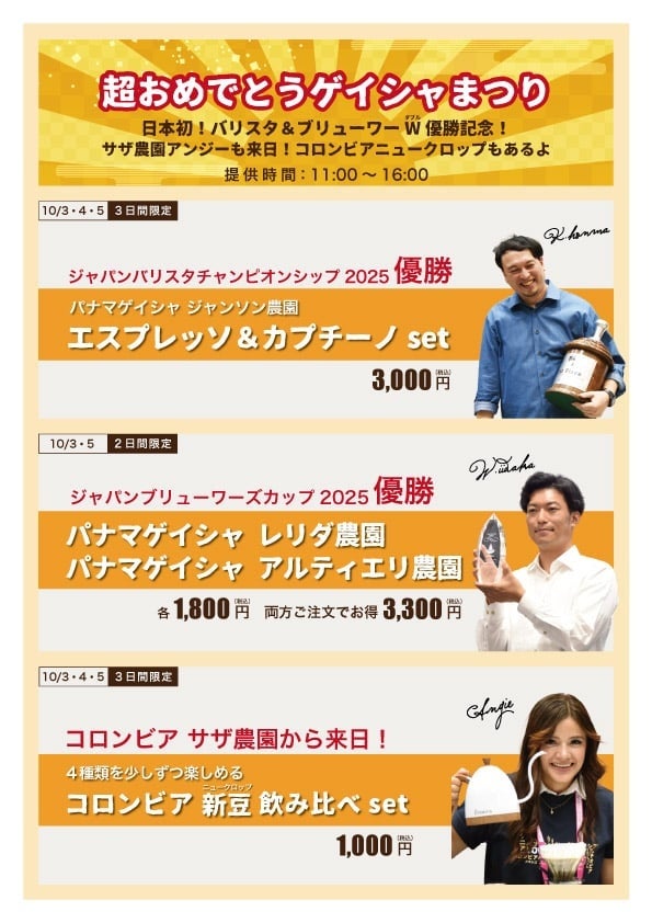 9月末の日本最大のコーヒーのイベントSCAJ2025でサザコーヒーの飯髙亘(いいだかわたる)と本間啓介(ほんまけいすけ)の2人がバリスタ&ブリューワーズカップでダブル優勝した(w優勝は日本初)ため。サザコーヒーKITTE丸の内店で「超おめでとうゲイシャまつり」を10月3、4、5の3日間行いパナマゲイシャでお祝いをします。また、10月1日は東京初進出になるJR品川駅ナカのサザコーヒーエキュート品川店の20周年オープンや、筑波大学アリアンサ店の7周年オープンなどめでたいイベントが重なっている。