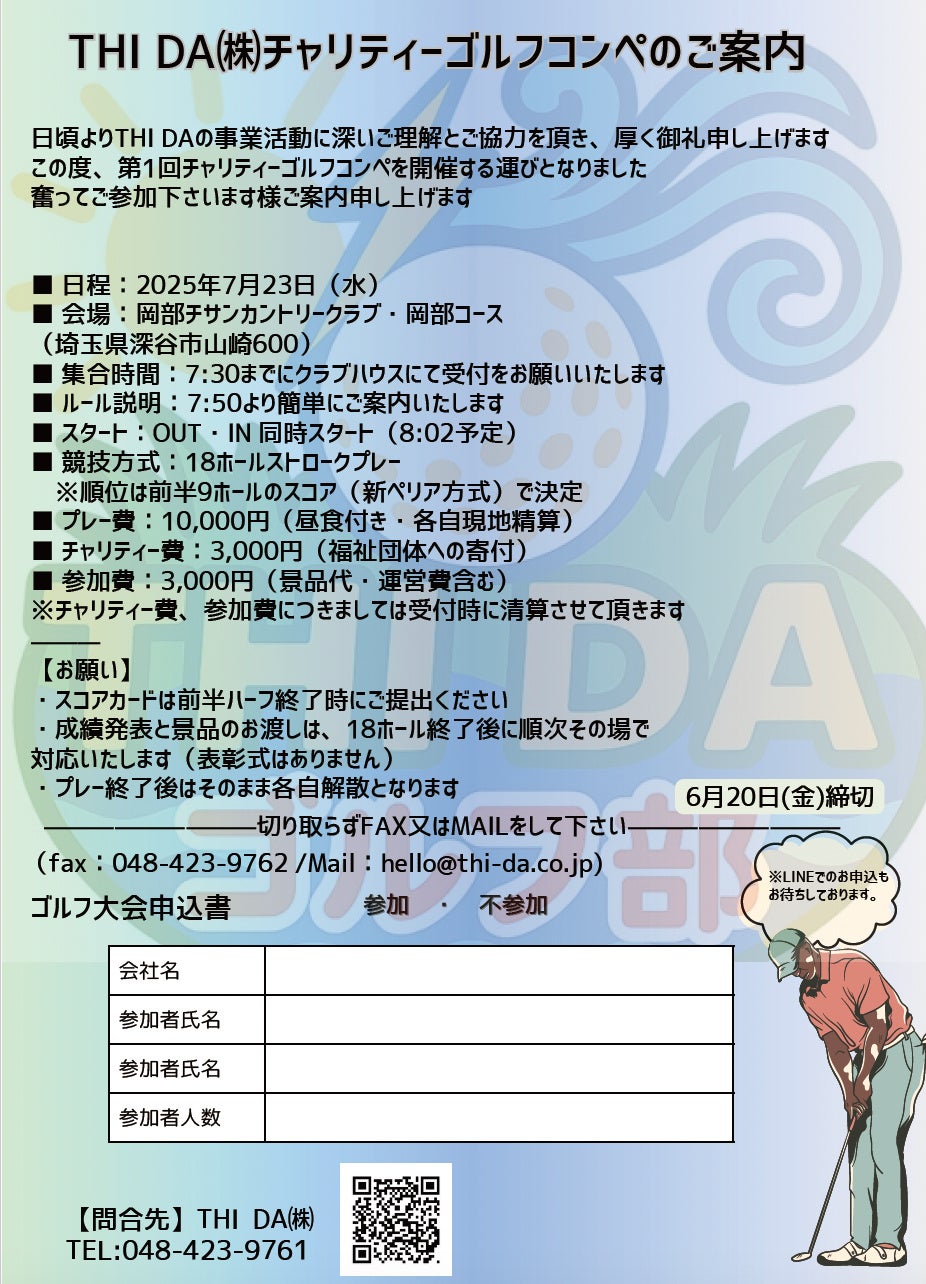 THI DA株式会社(所在地:埼玉県新座市畑中1-22-6、代表取締役:並里充)は、THI DAチャリティーゴルフコンペを2025年7月23日(水)に岡谷チサンカントリークラブ・岡部コースで開催いたします。