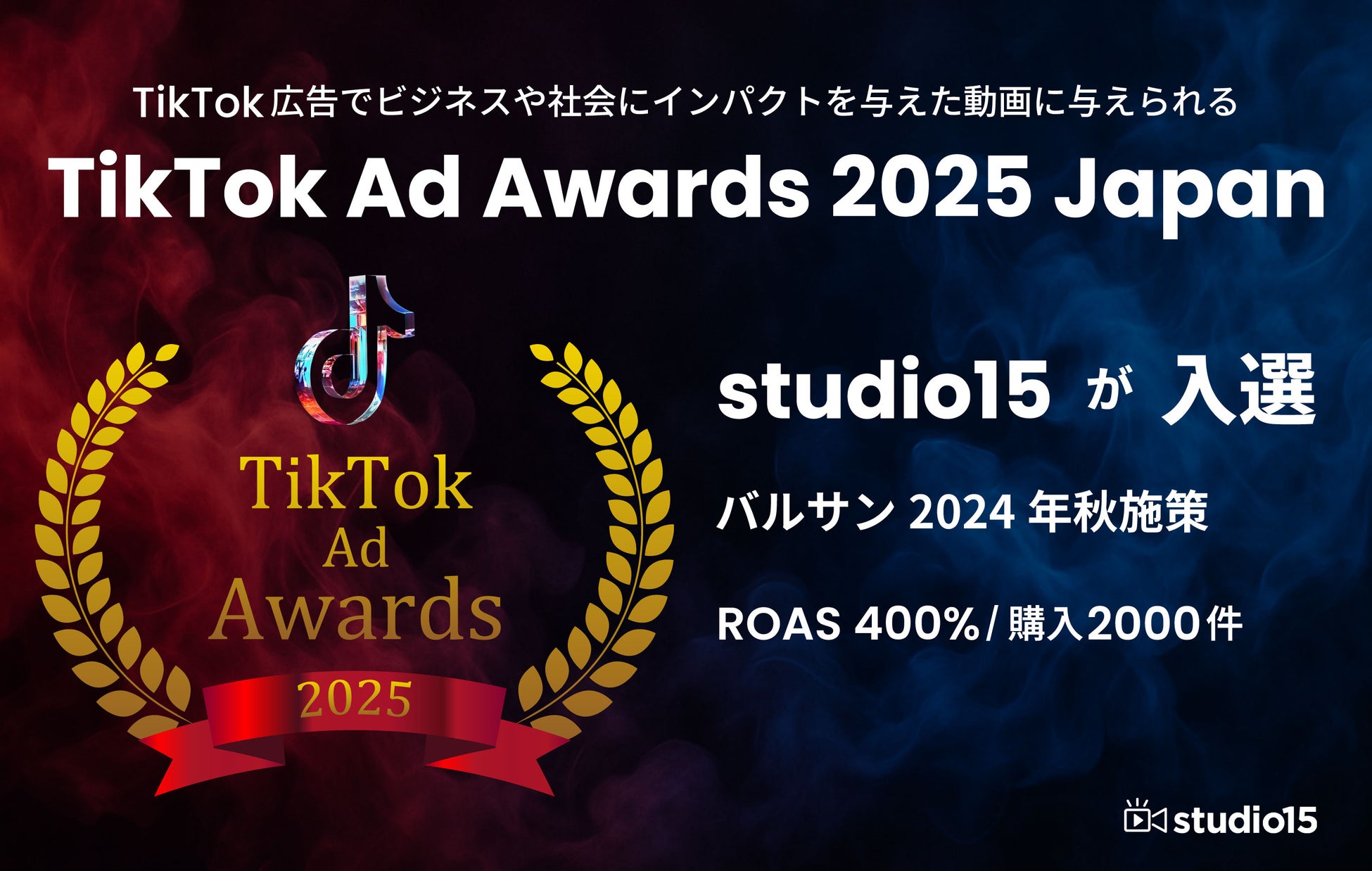 TikTokを中心としたショートムービー(短尺動画)領域で広告代理店事業・プロダクション事業を展開するstudio15株式会社(スタジオフィフティーン、本社:東京都渋谷区、代表取締役:岩佐 琢磨、以下 studio15)は、レック株式会社(本社:東京都中央区、代表取締役社長:青木 光男)が展開する「バルサン」シリーズのプロモーション施策として実施したTikTok広告キャンペーン「バルサン_2024年秋施策」において、TikTok Ad Awards 2025の「Greatest Performance 部門」に入選したことをお知らせいたします。