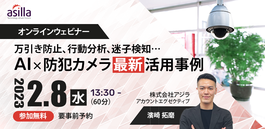 株式会社アジラ(本社:東京都町田市、代表取締役:木村大介、以下「アジラ」)は、オンラインウェビナー「AI×防犯カメラを使った活用事例 ~万引き防止、行動分析…AI×カメラでなにができるのか~」を2023年2月8日水曜日に開催いたします。
