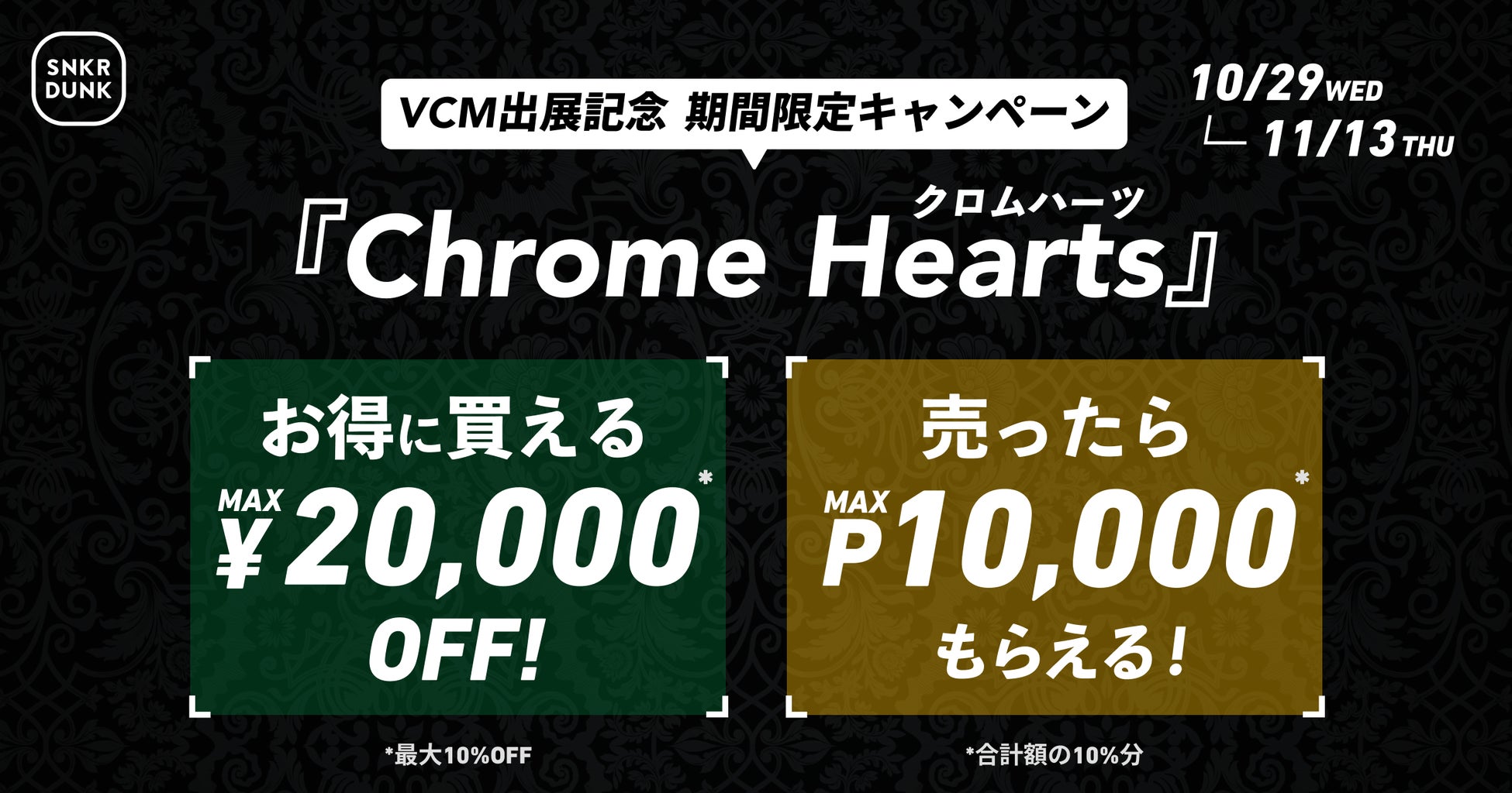 VCM VINTAGE MARKETへの協賛・出展を記念して、スニダンで人気の「クロムハーツ」アイテムを、売るのも買うのもお得な「VCM協賛・出展記念!クロムハーツキャンペーン」を開催いたします。