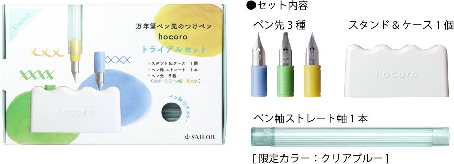 セット限定カラーの「ペン軸 ストレート」1本に、ペン先3種(細字、2.0mm 幅、筆文字)、スタンド& ケース1個がセットになったトライアルセットを数量限定で発売いたします。